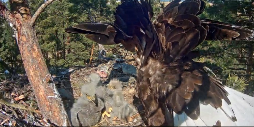 Widzimy, że dorośli są w pobliżu gniazda, chronią pisklaki przed intruzami. Choć pisklęta są duże, istnieje potencjalne zagrożenie ataku na nie.