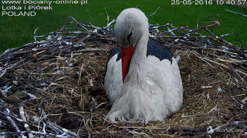 Niestety ok. 15-tej Lotka wyeliminowała najmłodsze pisklę. Można było zaobserwować, że maluch często leżał z łapkami w górze, a to nie jest pozycja silnego, zdrowego pisklaka.