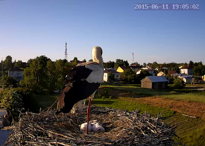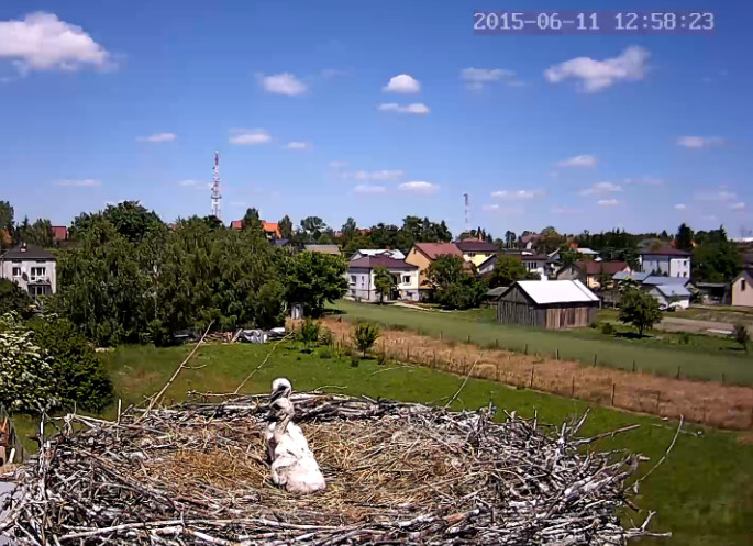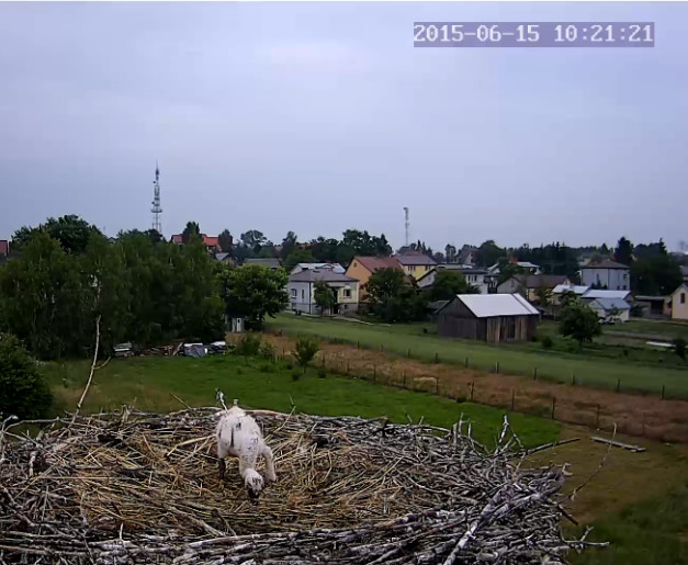 Dzisiaj maluchy zostały same. Rodziców nie było od 14,55 do 16,20. Brak opadów nie sprzyja bociankom. Pożywienia mniej.