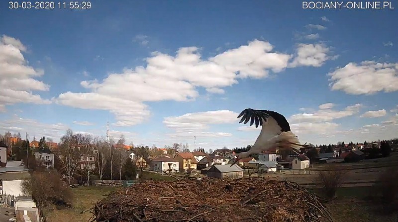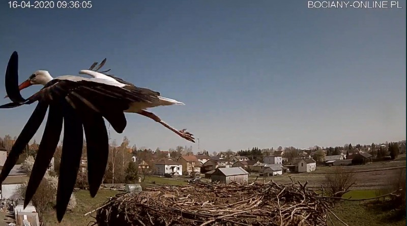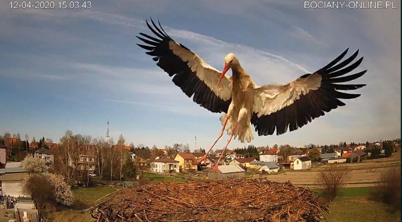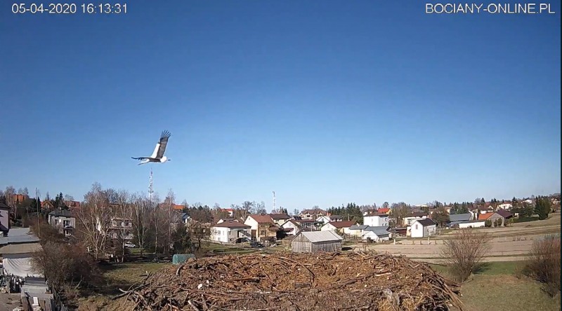 11 kwietnia - g. 07,40 pierwszy w sezonie bocian w gnieździe - turysta