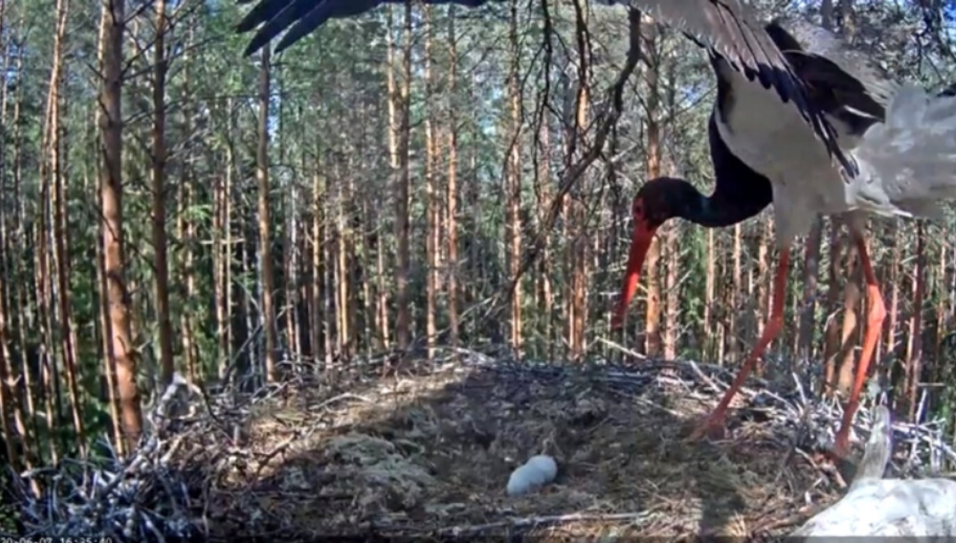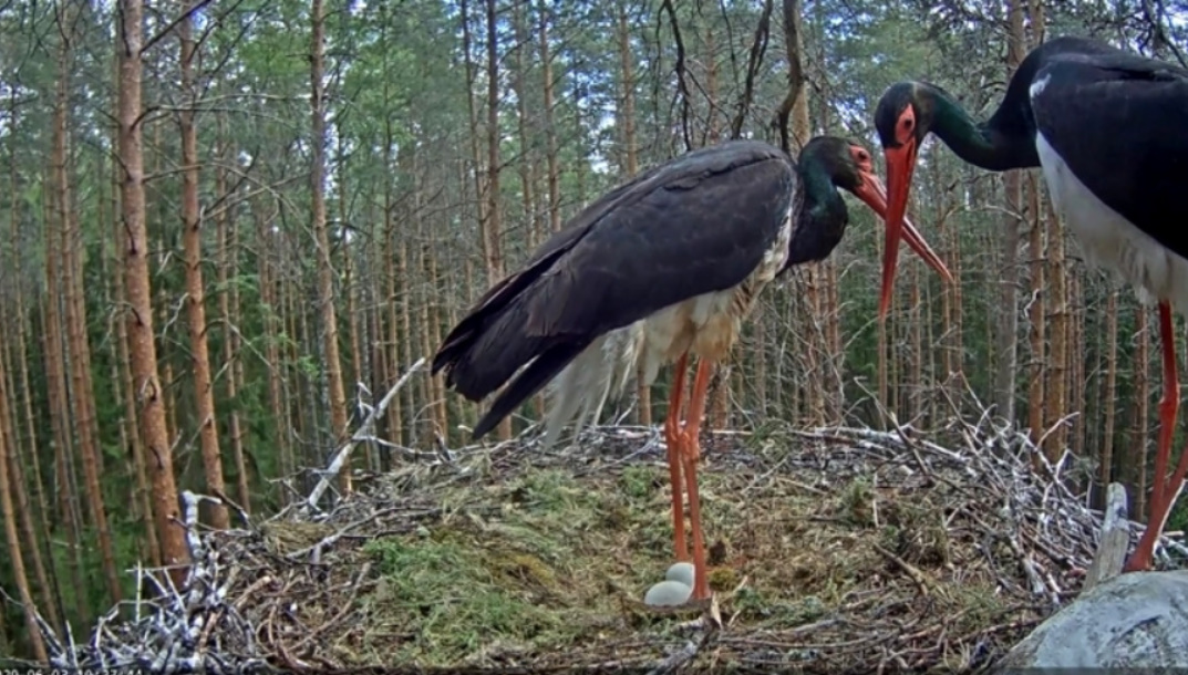 Bociany czarne wróciły do gniazda widzianego obecnie w kamerze zaledwie rok lub dwa lata temu. To stare sztuczne gniazdo. Nową platformę zbudowaliśmy wczesną wiosną 2021 roku. Biorąc pod uwagę krytyczną sytuację bociana czarnego w Estonii, to mały cud, że bociany tu wróciły.
