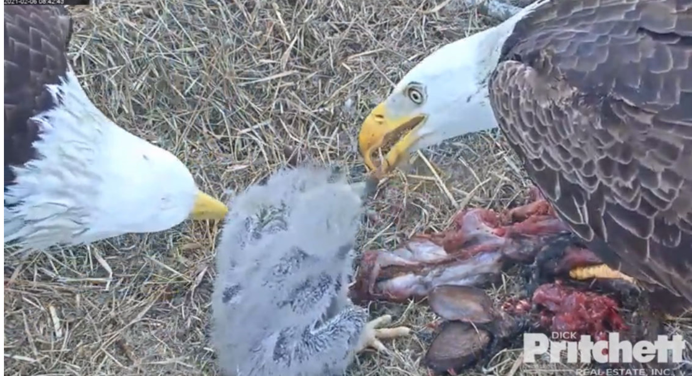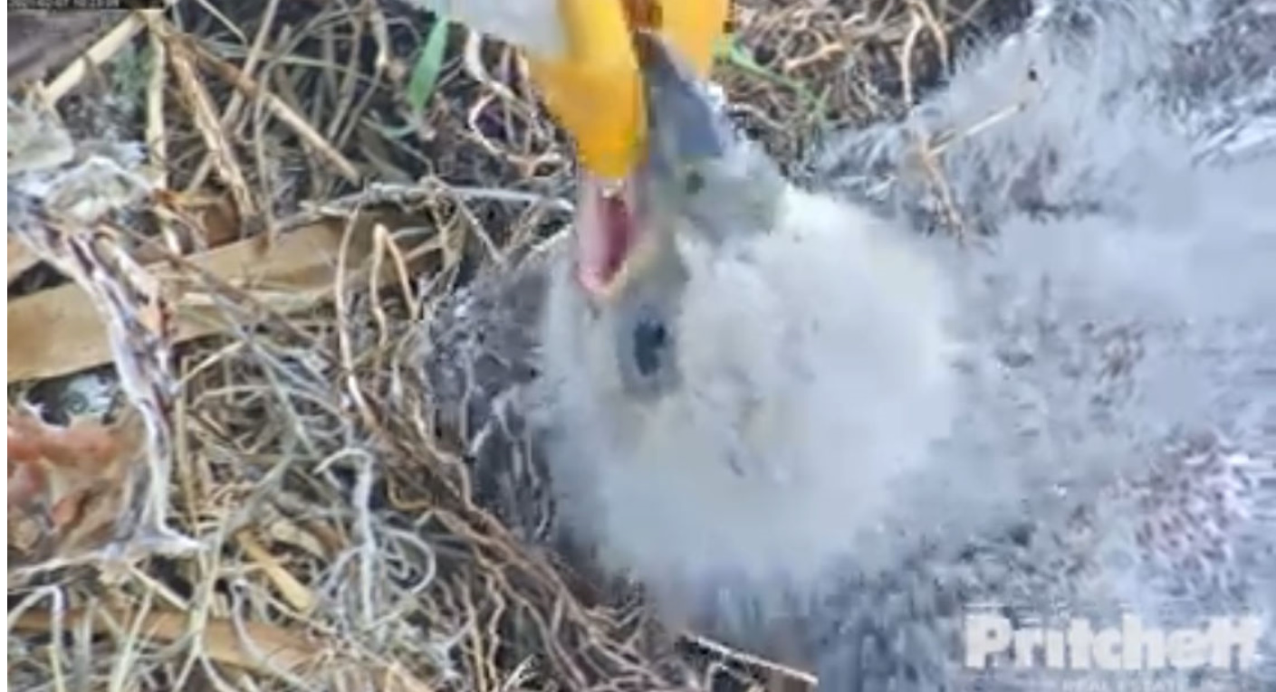 " Młode mają się bardzo dobrze , mają wielki apetyt. Na poprzednich zdjęciach, które publikowaliśmy, ich oczy wyglądały znacznie lepiej, ponieważ staraliśmy się utrzymać je w czystości i sterylności. Nadal niestety oczy piskląt są zainfekowane. Bieliki otrzymują antybiotyki trzy razy dziennie w kroplach do oczu . Zaczęto dziś iniekcje z antybiotyku aby pomóc w walce z infekcją.