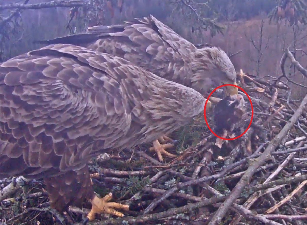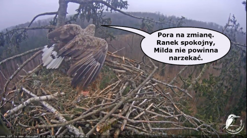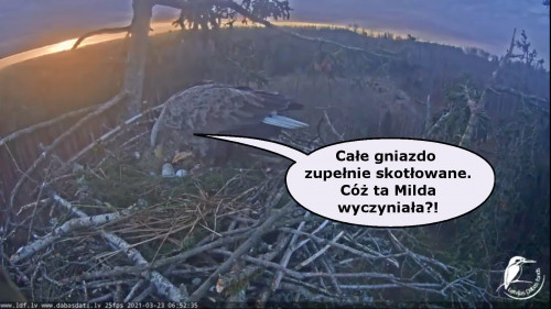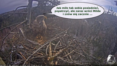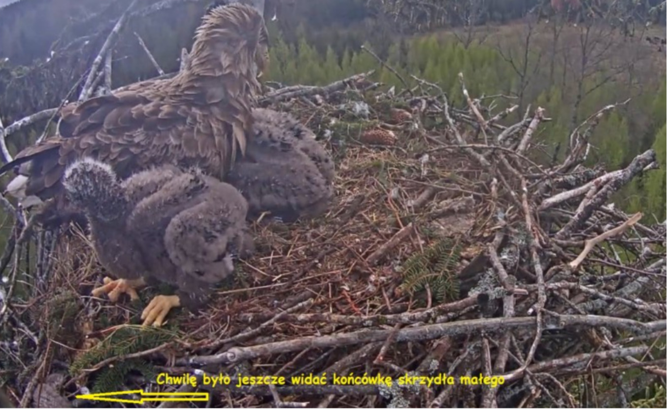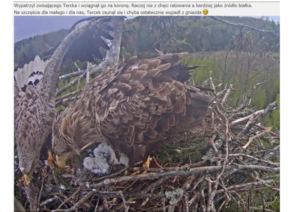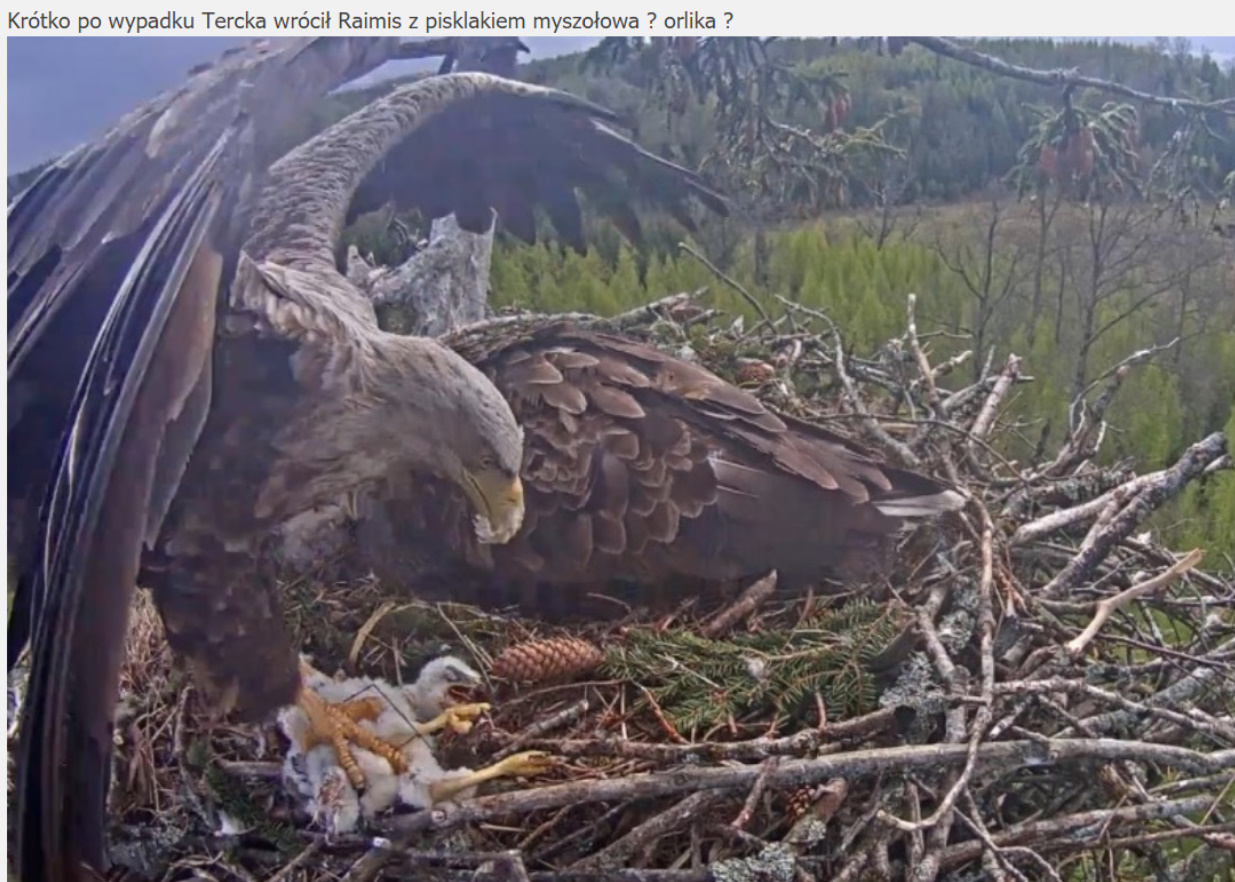 Jeszcze wczoraj mieliśmy nadzieję na odchowanie całej trójki. Tercek jakby odważniejszy się zrobił, sprytniejszy. Nie widzimy każdego karmienia, często Milda zasłania sobą ten widok. Ale sądząc po blojdzie Tercka było jakby lepiej.