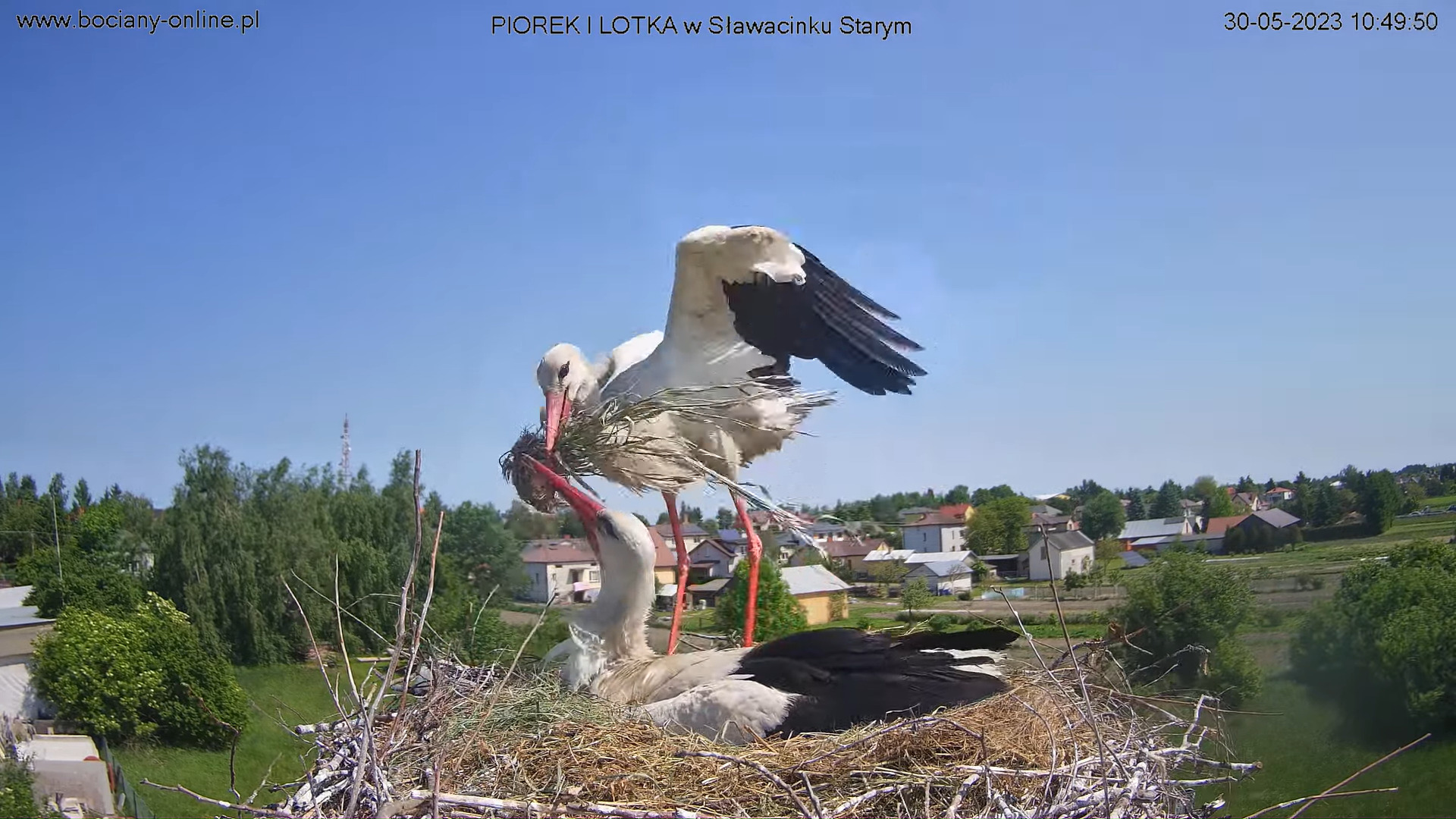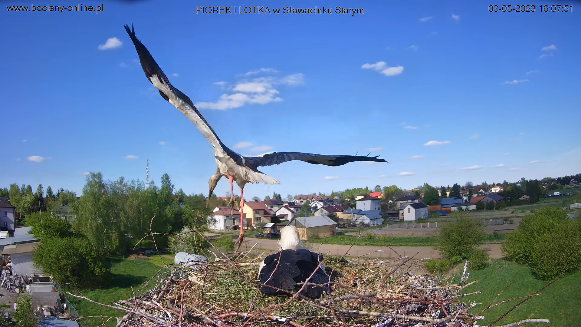 Kolejna wizytacja, tym razem bez lądowania - jeden obcy bocian nad gniazdem, drugi widoczny na maszcie od małej kamery.