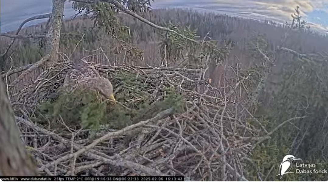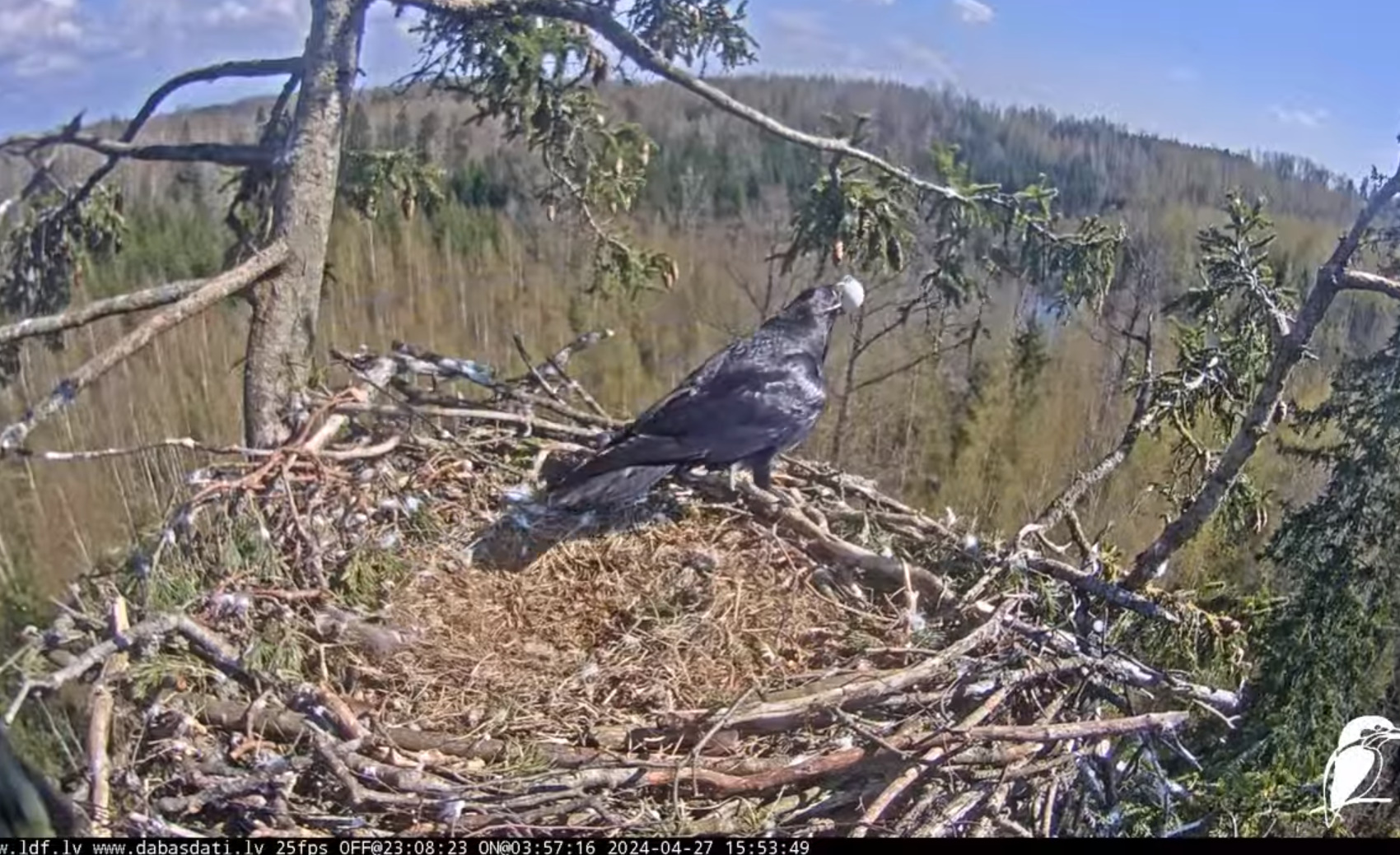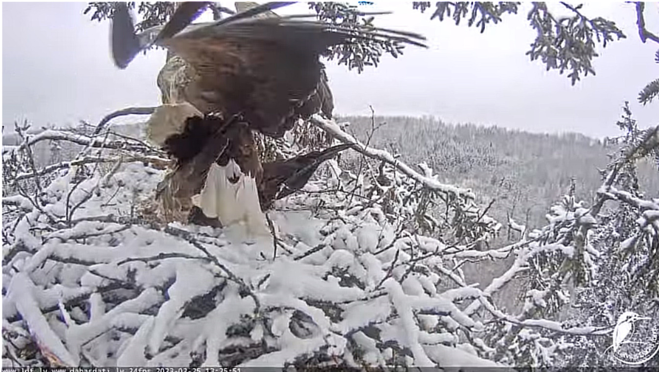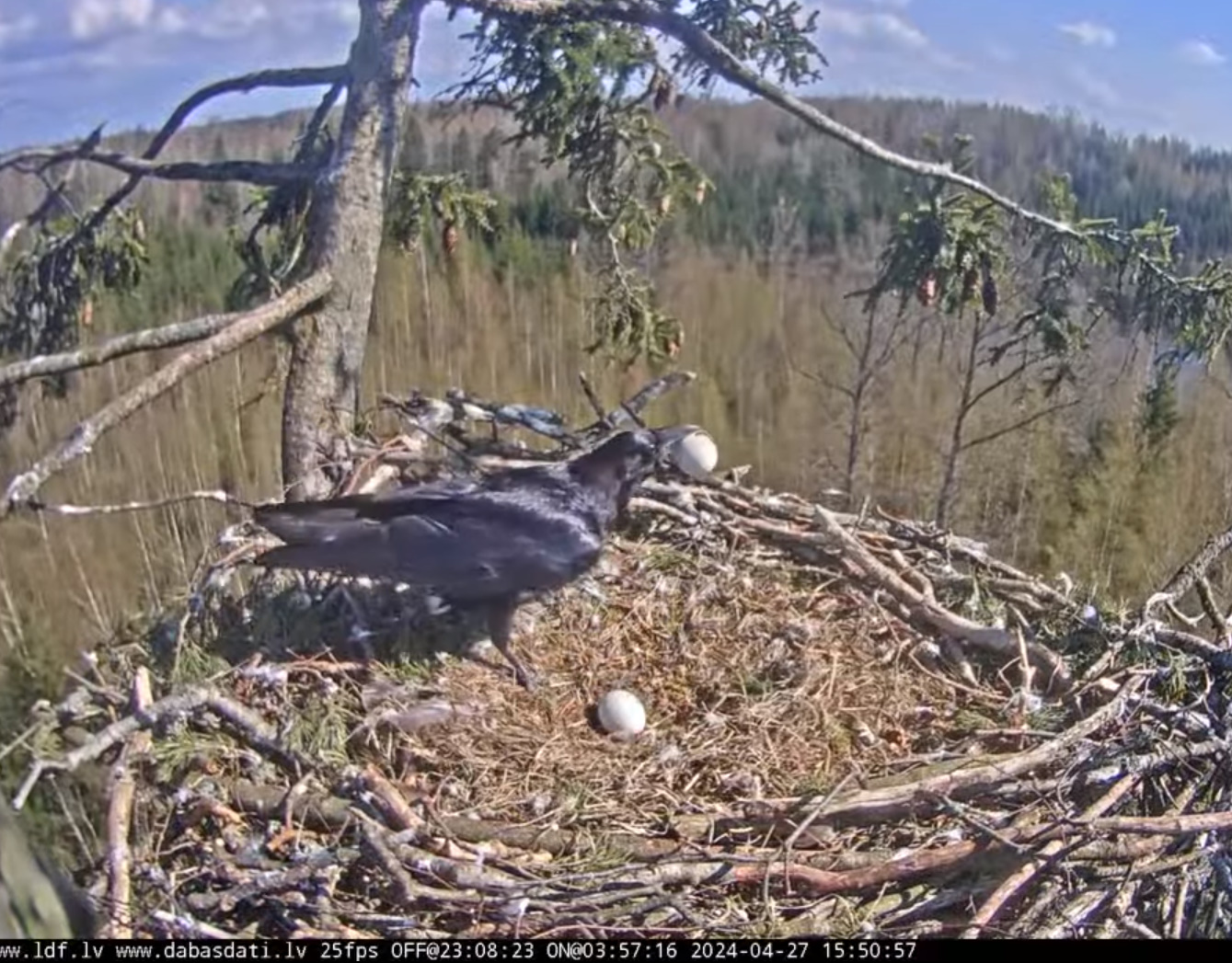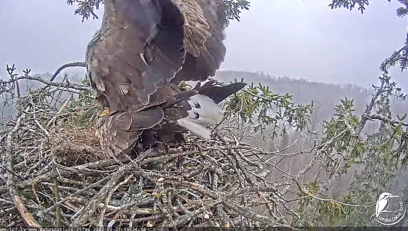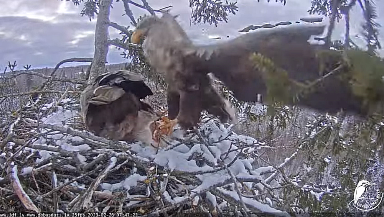 Obca spokojnie rozejrzała się i o 18,04 zabrała się za rozłupywanie jaj. Voldis odleciał.