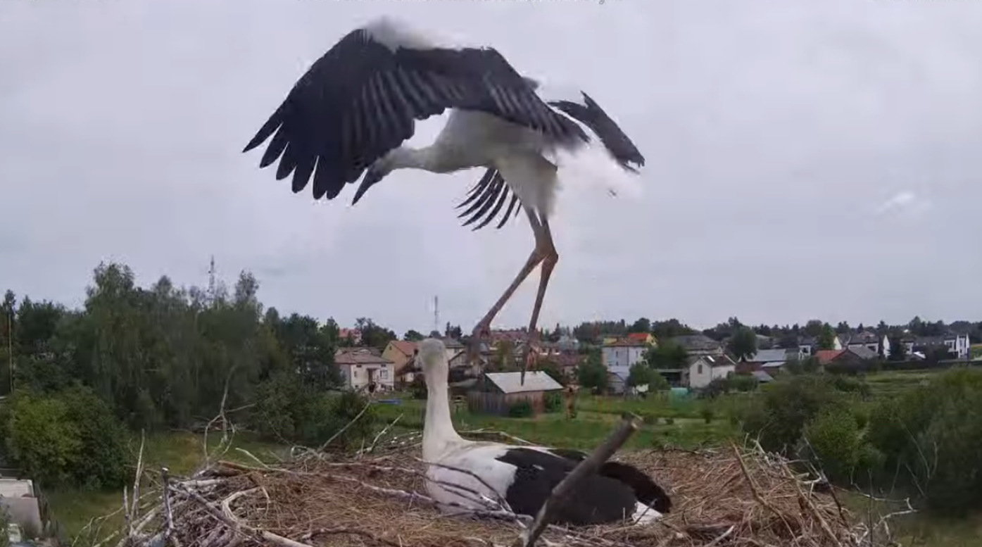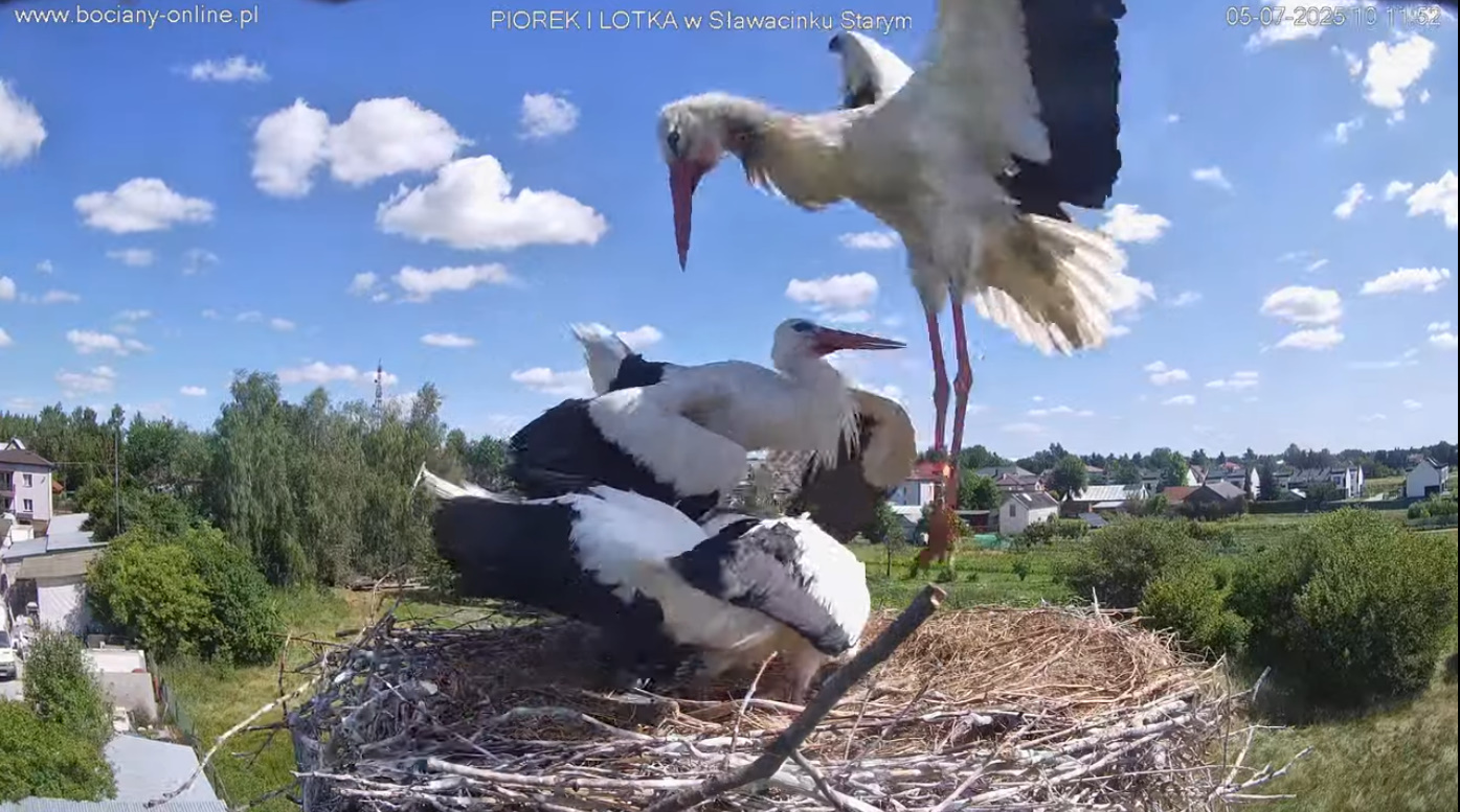 Wylądował dorosły bociek, młode nie zaatakowały od razu dzioba "rodzica" jak to w ich zwyczaju. Obcy bociek nie był agresywny ( poza jednym postraszeniem dziobem). Obcy obszedł gniazdo i ... wskoczył na kamerkę
