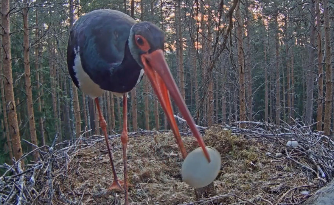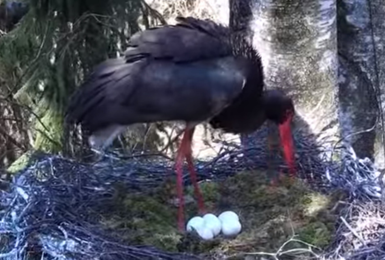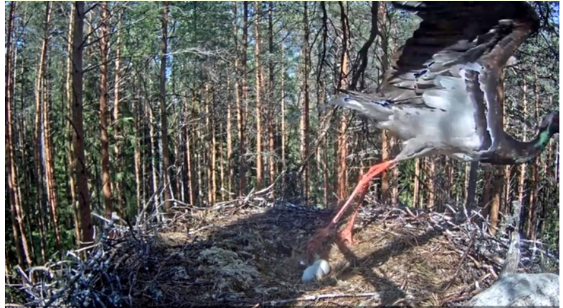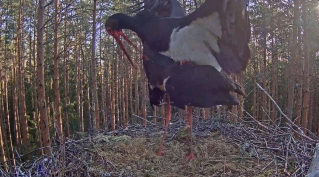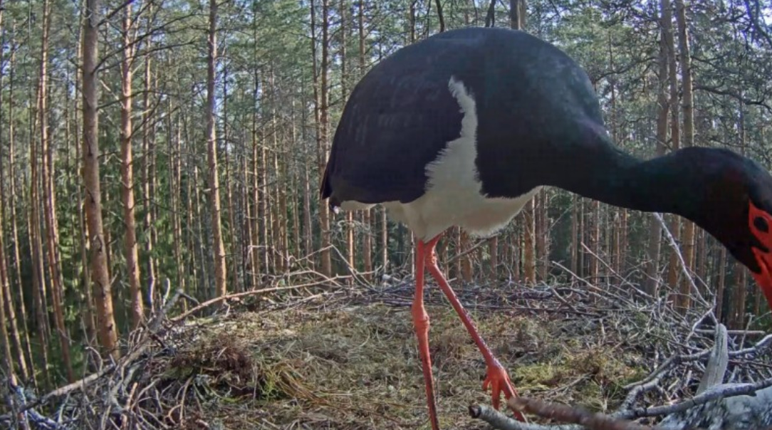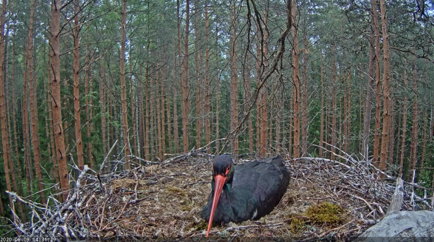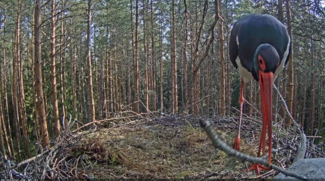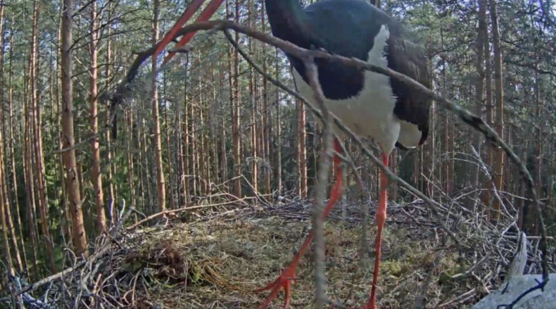Bociany czarne wróciły do gniazda widzianego obecnie w kamerze zaledwie rok lub dwa lata temu. To stare sztuczne gniazdo. Nową platformę zbudowaliśmy wczesną wiosną 2021 roku. Biorąc pod uwagę krytyczną sytuację bociana czarnego w Estonii, to mały cud, że bociany tu wróciły.