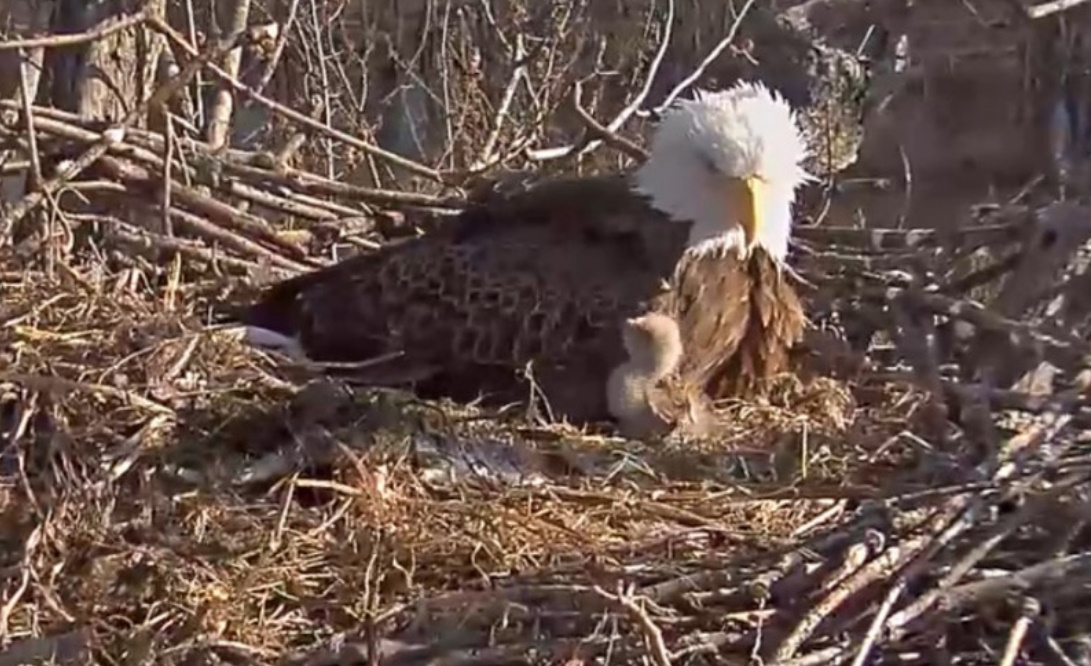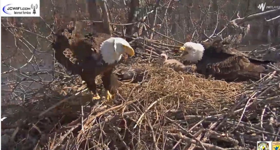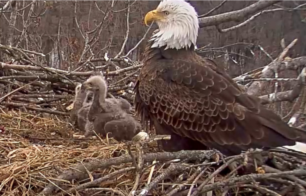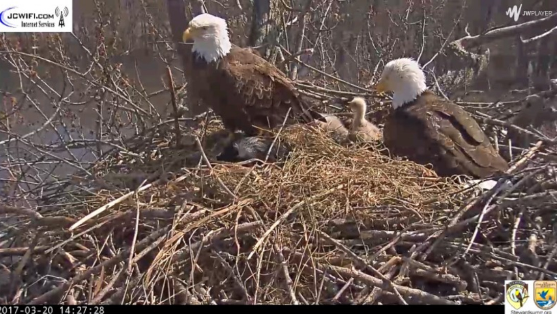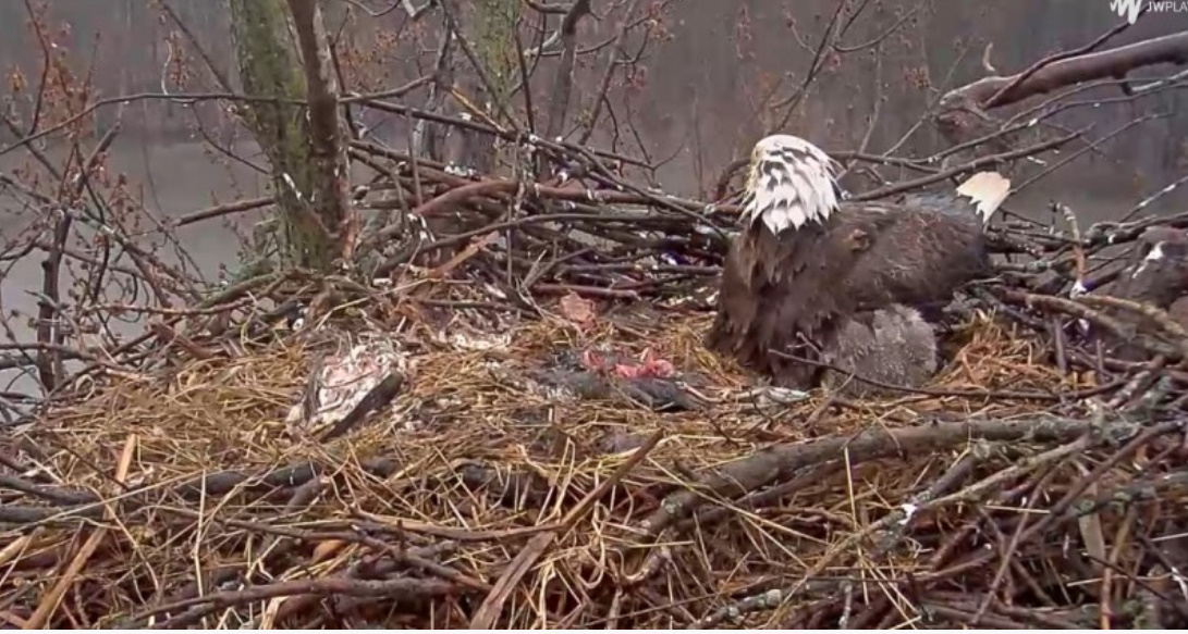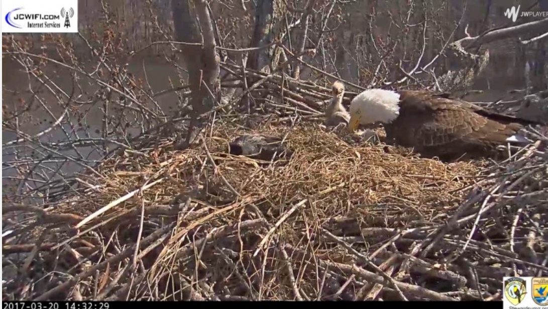 Krótko przed 18,00 w piątek okazało się, że gniazdo zostało zaatakowane przez innego bielika. W trakcie obrony gniazda jeden z naszych rodziców podjął walkę z obcym bielikiem. Po tym starciu, niestety nie powrócił . Dzięki USFWS Savanna District Manager, Ed Britton i Assistant District Manager Russell Engelke podjęto wysiłki w przeszukiwaniu całego obszaru, aby zlokalizować bielika. Niestety nie byli w stanie go znaleźć . Pozostali w gnieździe rodzice,to najprawdopodobniej Waleczny I i Waleczny II. Jeden z nich siedział na gnieździe przez całą noc , został zmieniony rankiem.Obaj teraz są na drzewach w pobliżu gniazda, ale aktywność w lesie ( odgłosy grupy poszukiwawczej) spowodowała ich niepokój. Mamy nadzieję, że będą dbać o swoje młode, tak jak robili to w nocy i dziś rano. NATURA POTRAFI BYĆ OKRUTNA.