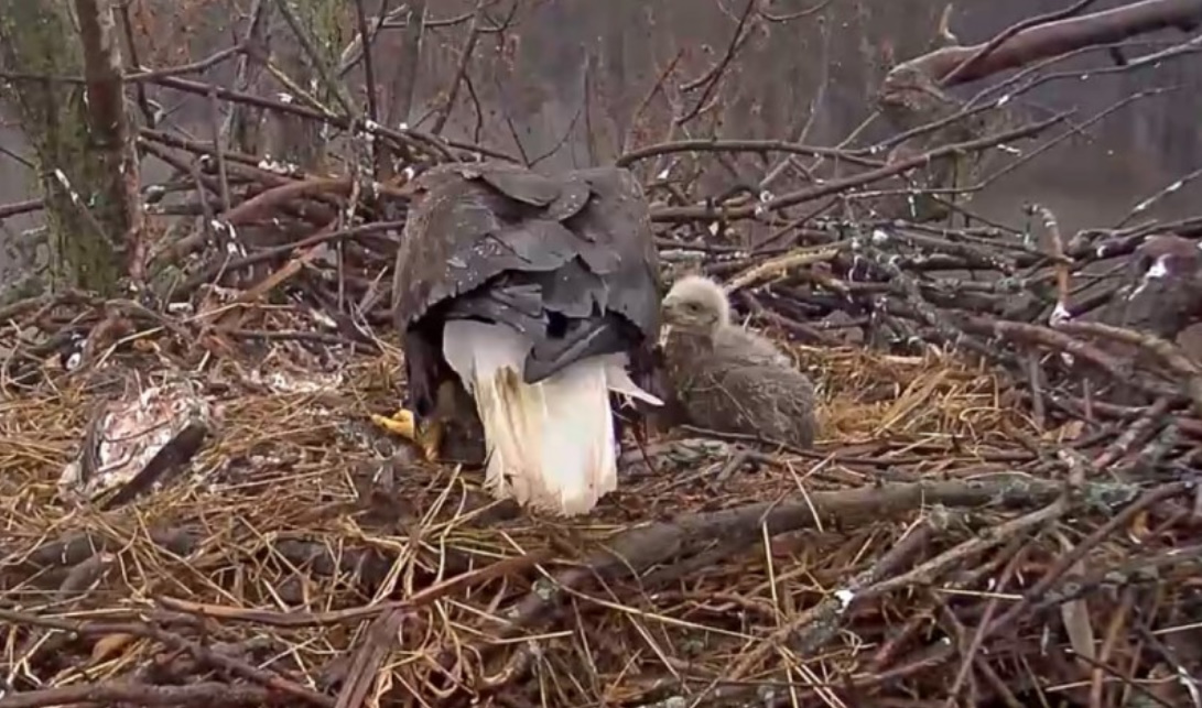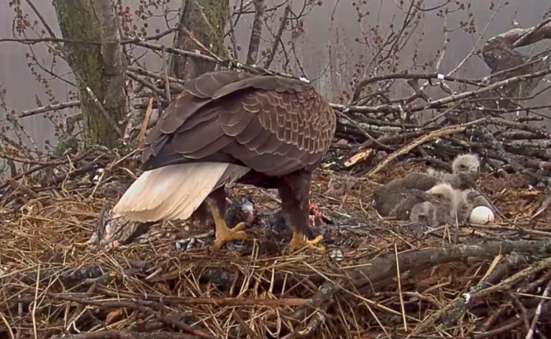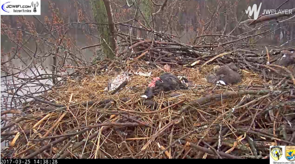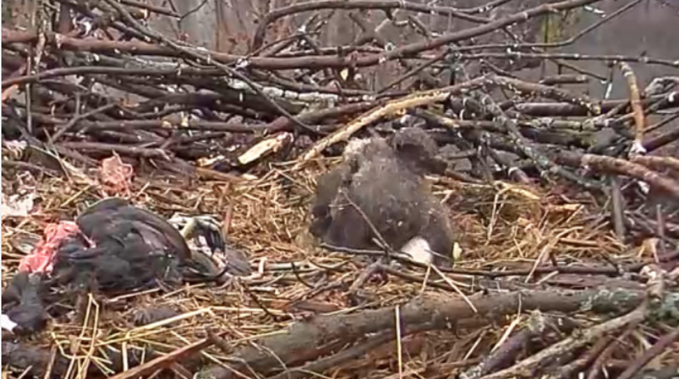"Wczoraj dorosły bielik, który zajmował się młodymi opuścił gniazdo na 5 godzin. Temperatura jest niska z deszczem. Młode bieliki nie są wodoodporne,mogą też ulec hipotermii. Dobra wiadomość jest taka, że teraz mamy jednego dorosłego na gnieździe, który intensywnie ogrzewa młode. Kamera pozostanie wyłączona, dopóki nie zobaczymy, co się dzieje z małymi. Oglądanie scen w naturze, takich jak ta, jest bardzo trudne , tym bardziej, że natura bywa bardzo okrutna. Musimy pamiętać, że kamery, które zainstalowaliśmy mają służyć do obserwacji a nie interwencji."
