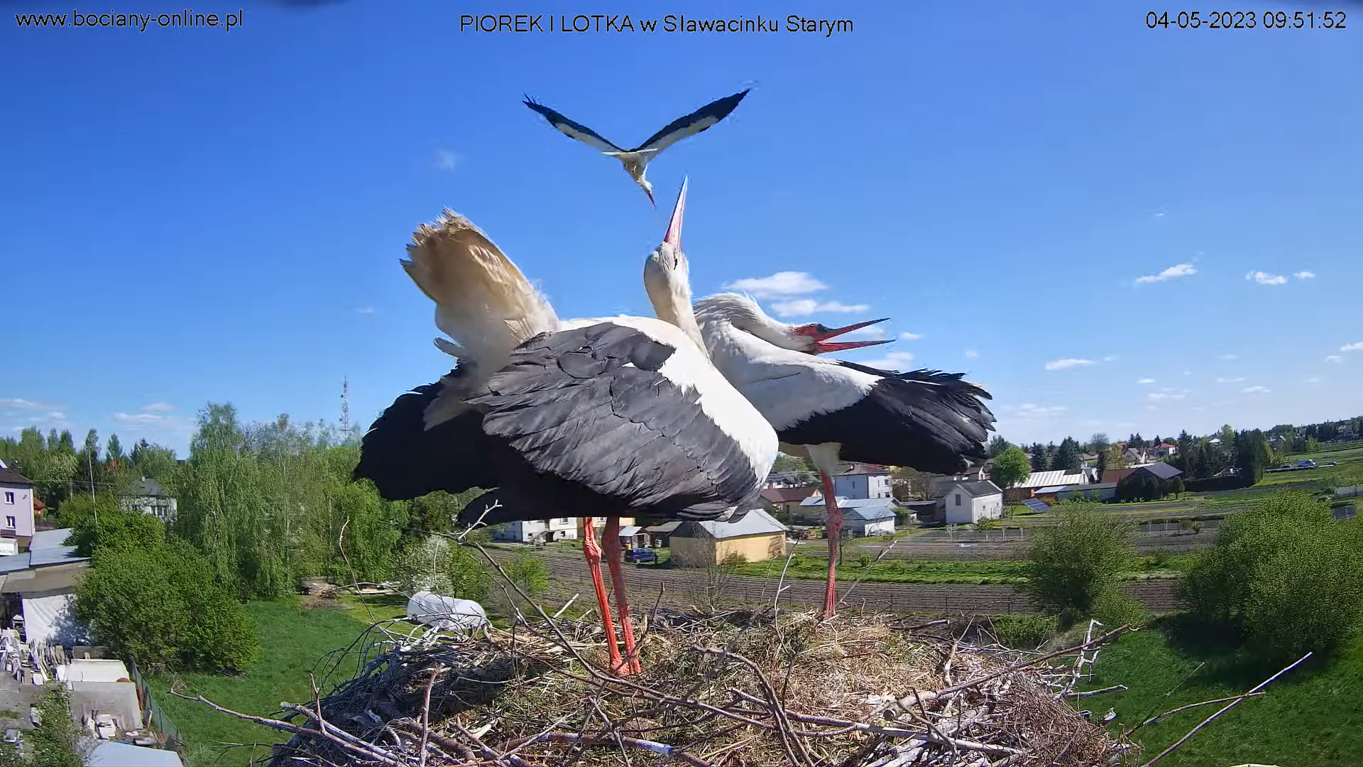 Kolejna wizytacja, tym razem bez lądowania - jeden obcy bocian nad gniazdem, drugi widoczny na maszcie od małej kamery.