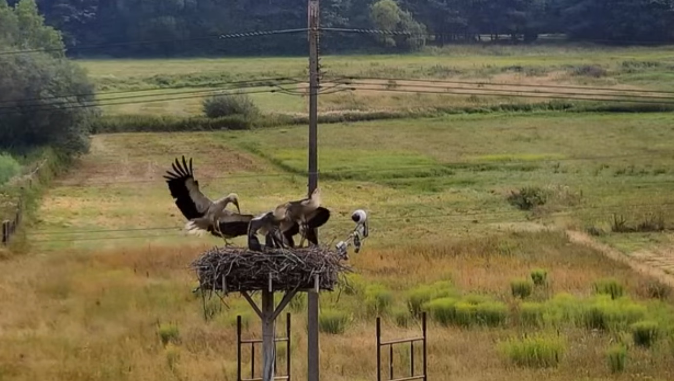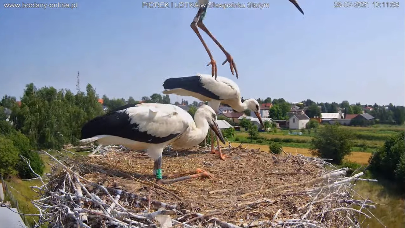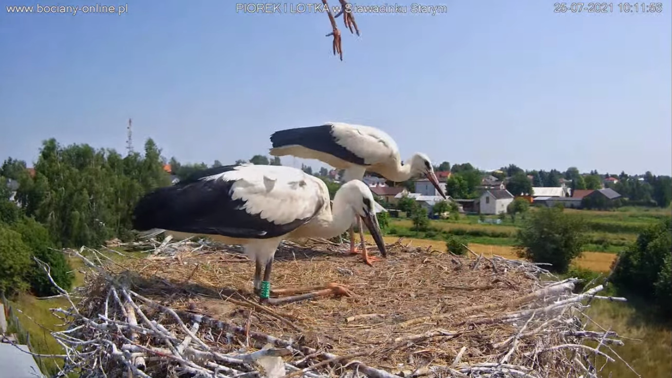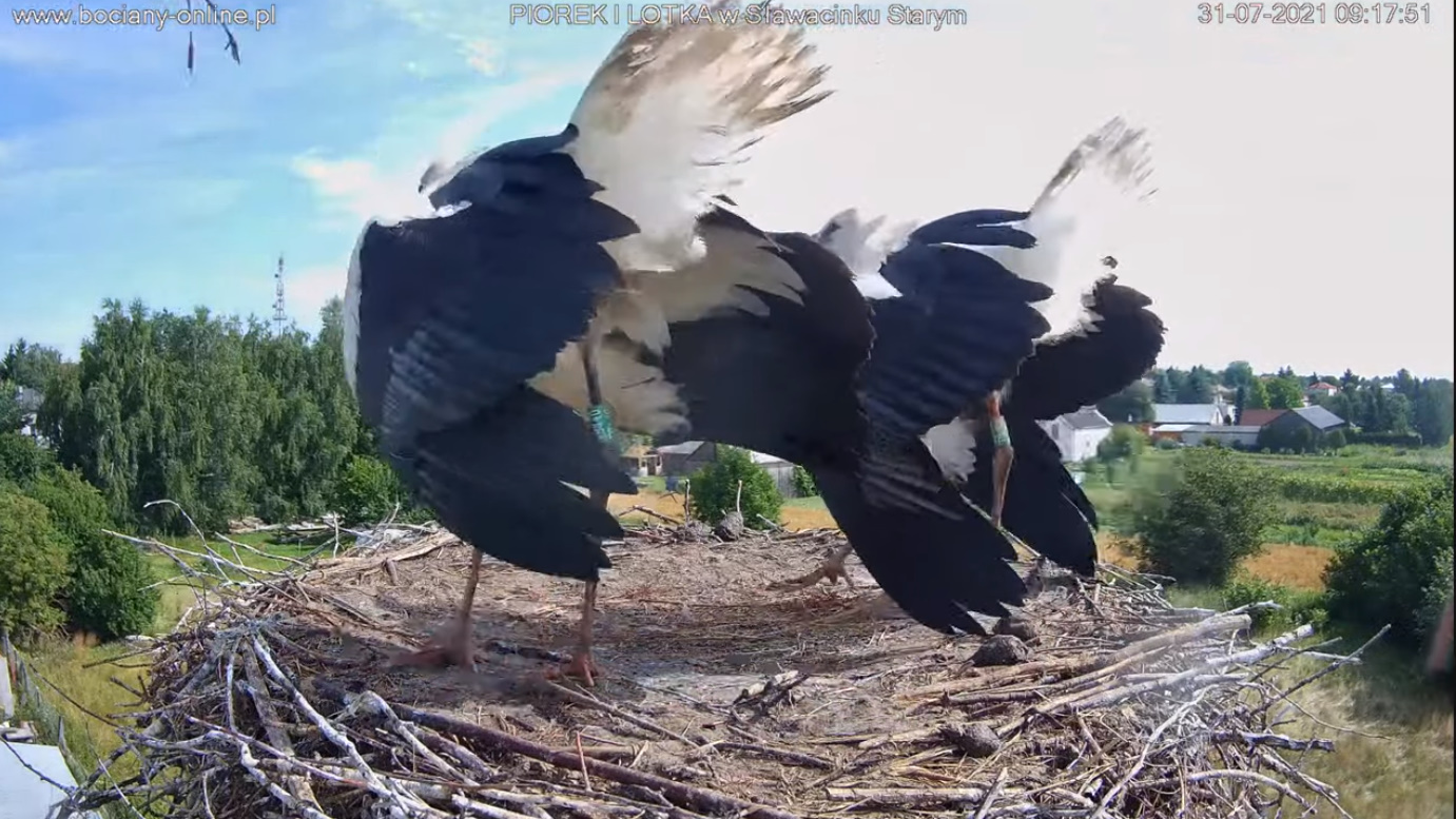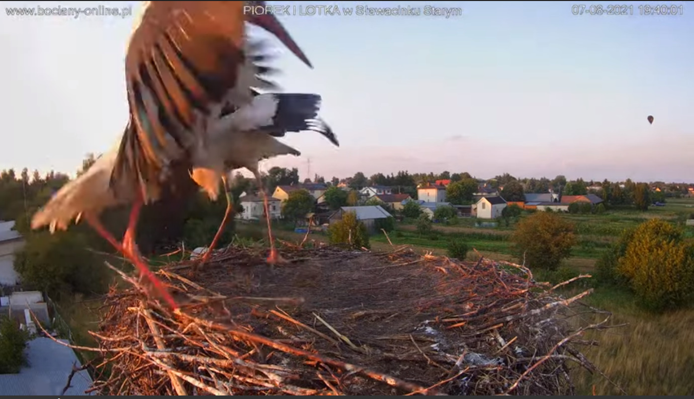 Wczoraj rano - wrócił Piór, potem dołączyła Lotka, coś pouzgadniali, Lotka wyleciała, zrobiła parę kółek nad gniazdem. Dołączył do niej Piór. Chwilę krążyli nad Sławacinkiem i znikli. Cały dzień zastanawialiśmy się, czy wrócą. Wrócił sam Piórek. Gentelman odprowadził żonę i został jeszcze ... może dla nas ?