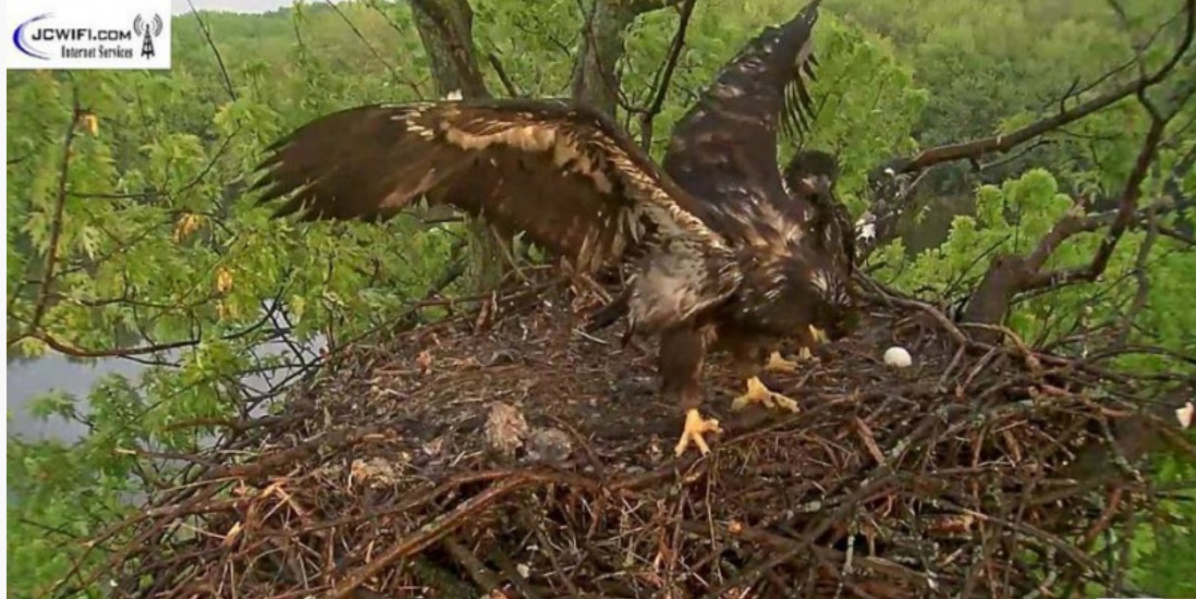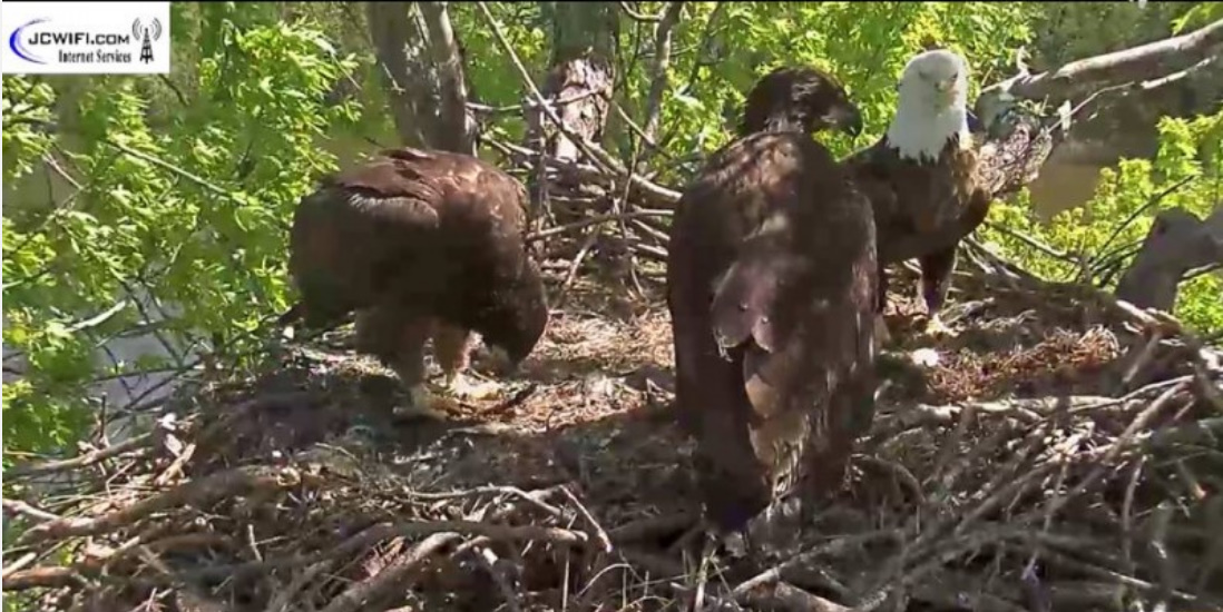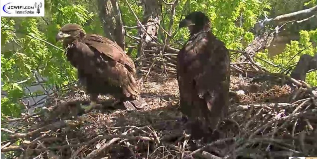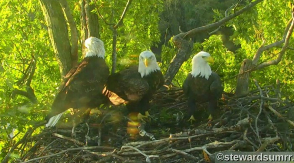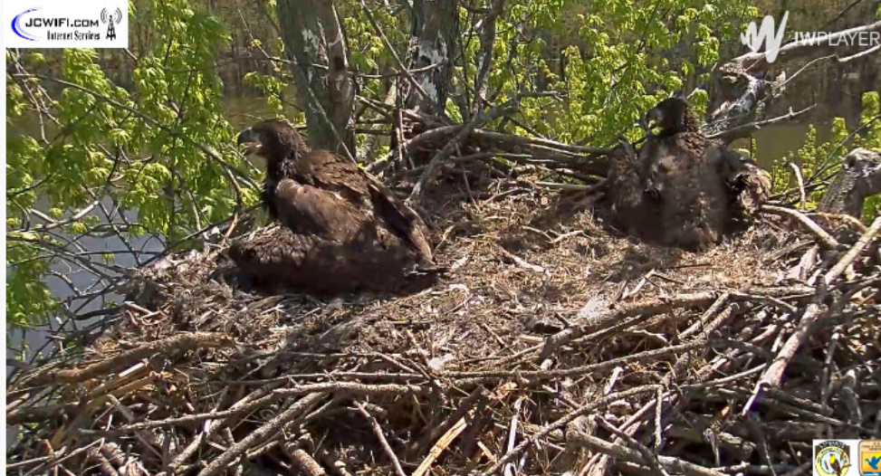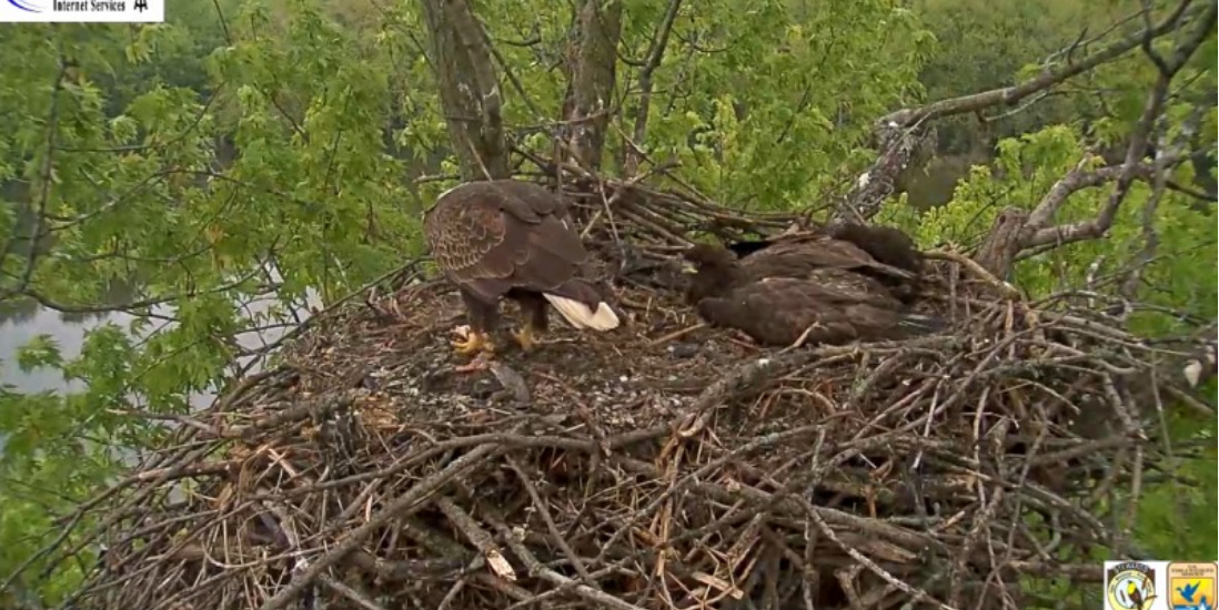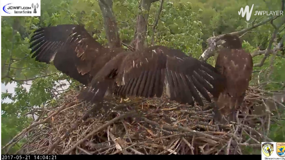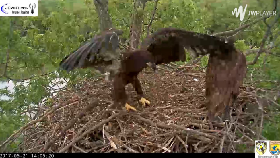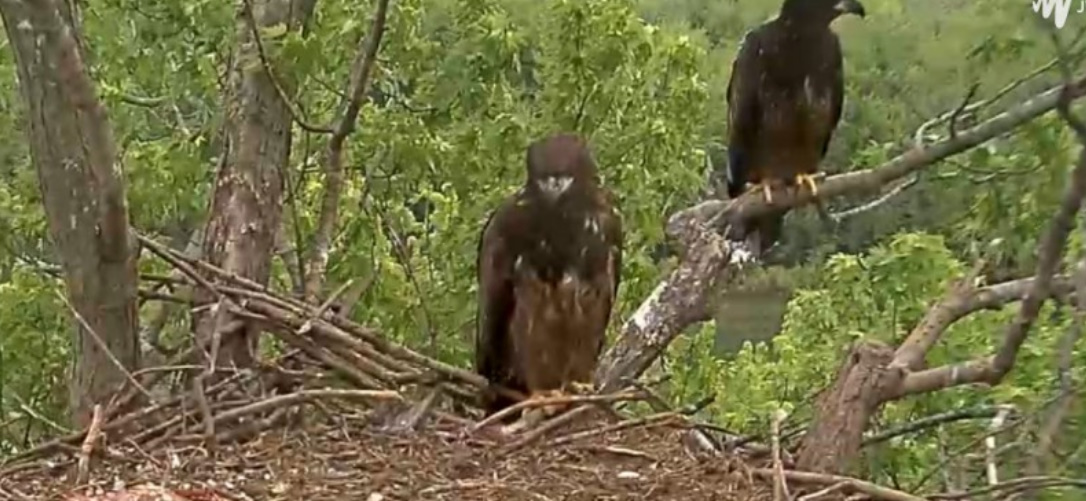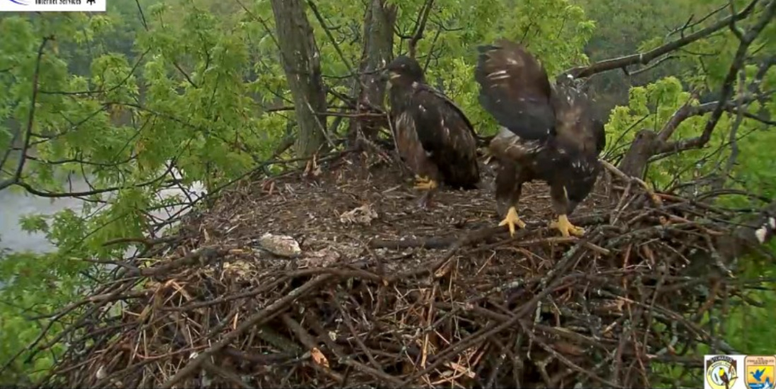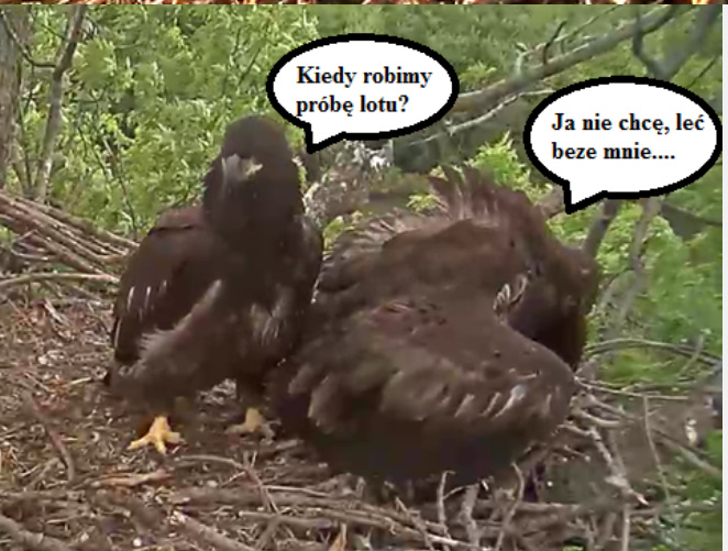 Ataki na gniazdo na szczęście nie zdarzają się już tak nachalnie jak to było jeszcze niedawno, czasami tylko nad gniazdem przeleci jakiś intruz. Maluchy mają już prawie 2 miesiące i będą uczyć się samodzielności. Tatuśkowie wytrwale dostarczają prowiant młodzieży, która stopniowo zaczyna jeść samodzielnie i oczywiście poznaje sztukę przetrwania - czyli pilnowanie swoich porcji i kradzież porcji brata jeśli brzuszek woła o więcej