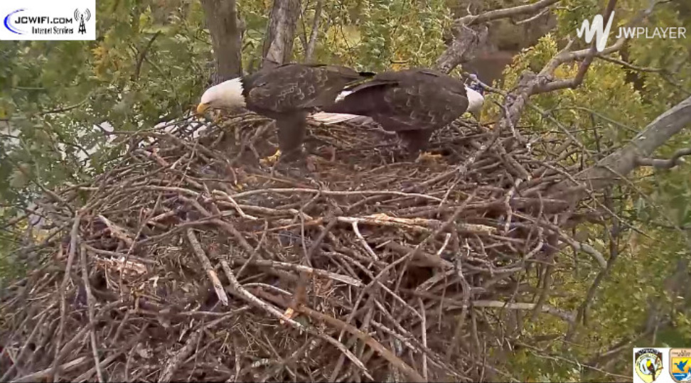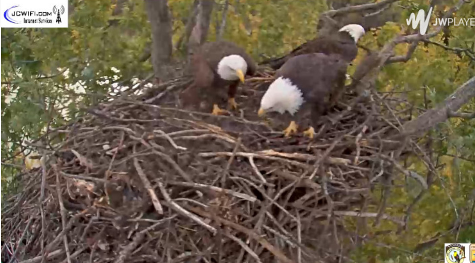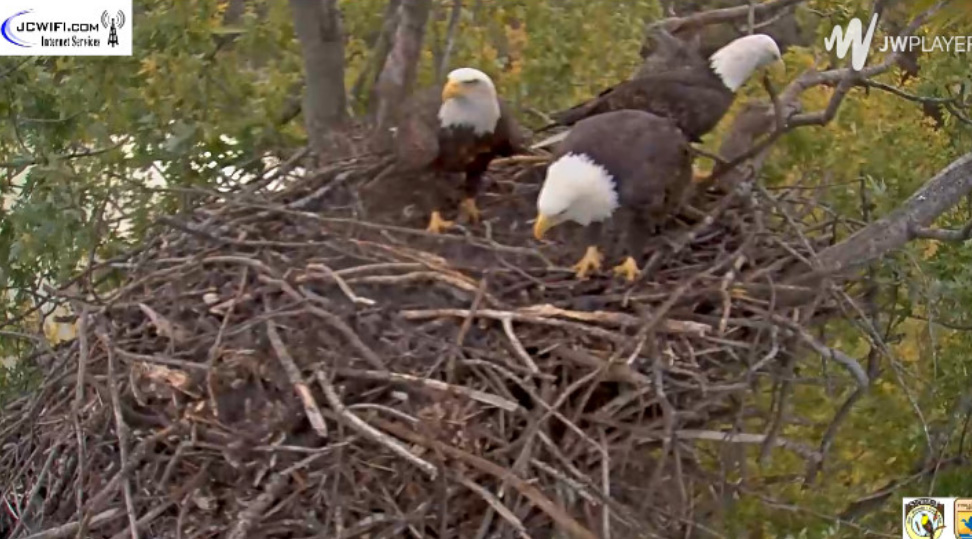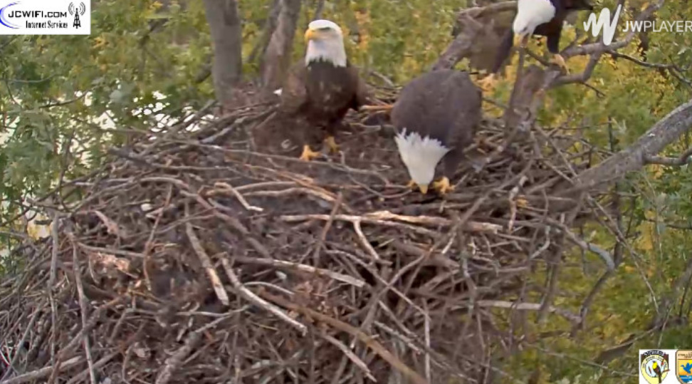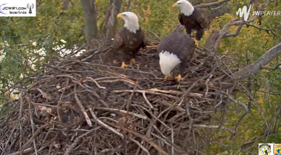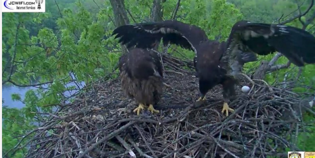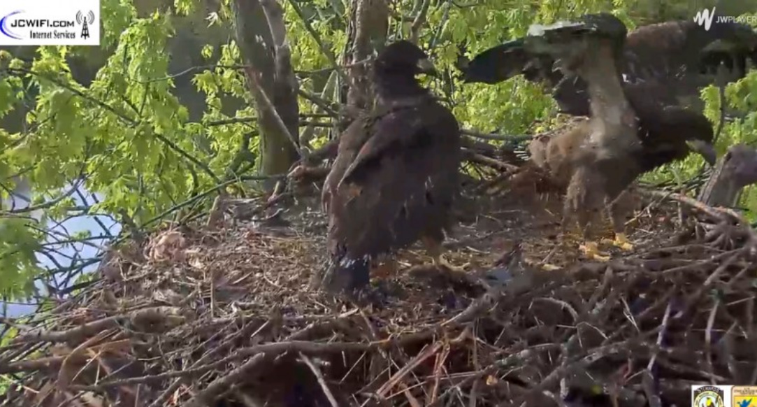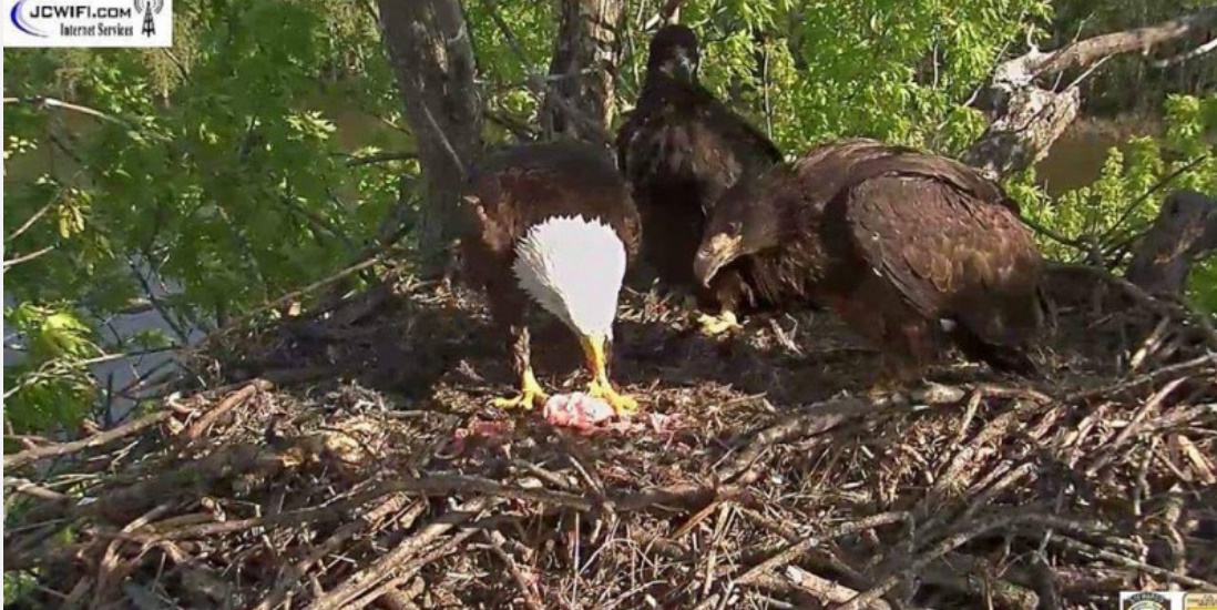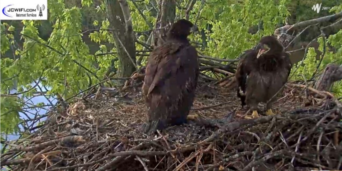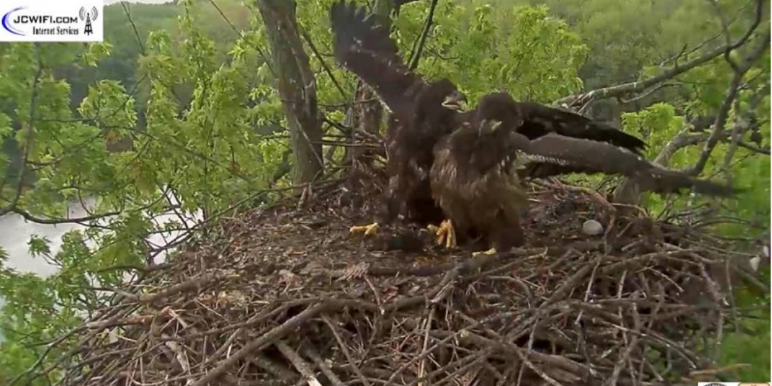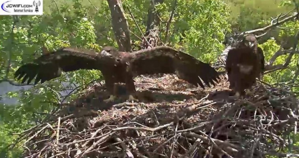 Ataki na gniazdo na szczęście nie zdarzają się już tak nachalnie jak to było jeszcze niedawno, czasami tylko nad gniazdem przeleci jakiś intruz. Maluchy mają już prawie 2 miesiące i będą uczyć się samodzielności. Tatuśkowie wytrwale dostarczają prowiant młodzieży, która stopniowo zaczyna jeść samodzielnie i oczywiście poznaje sztukę przetrwania - czyli pilnowanie swoich porcji i kradzież porcji brata jeśli brzuszek woła o więcej
