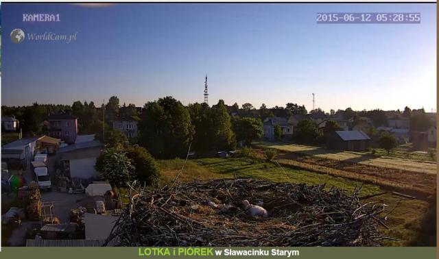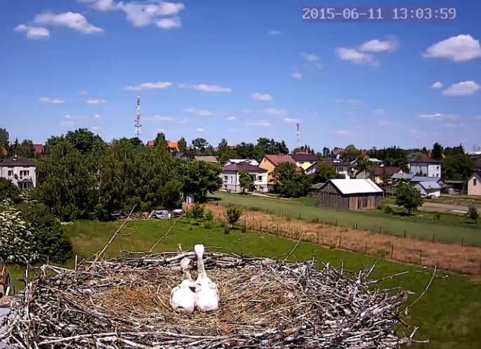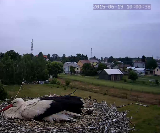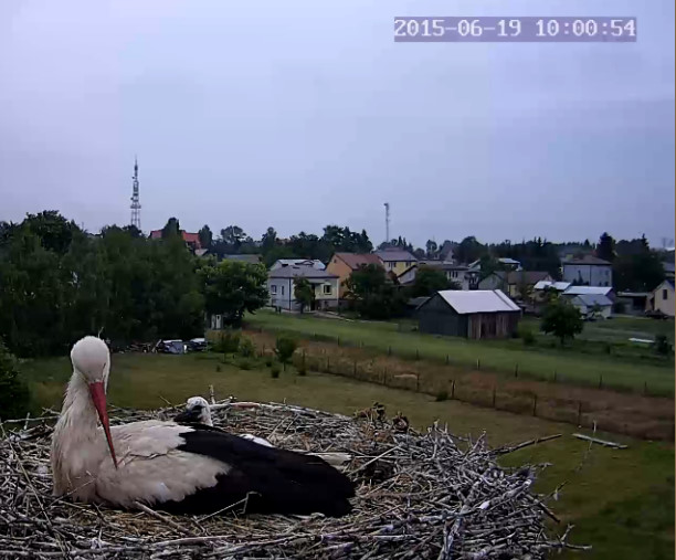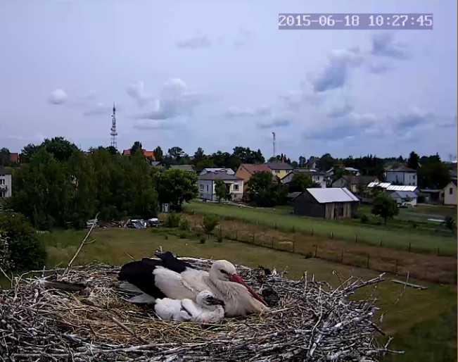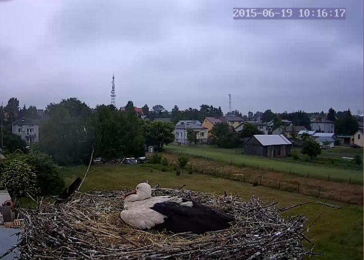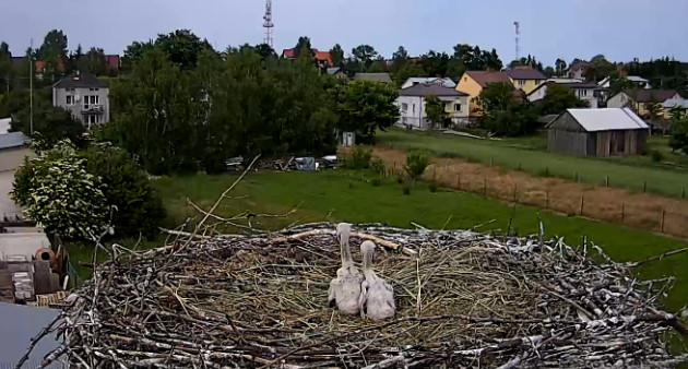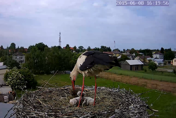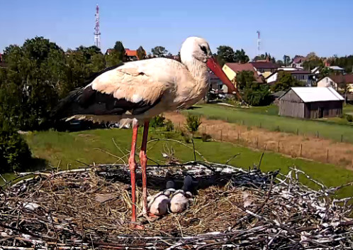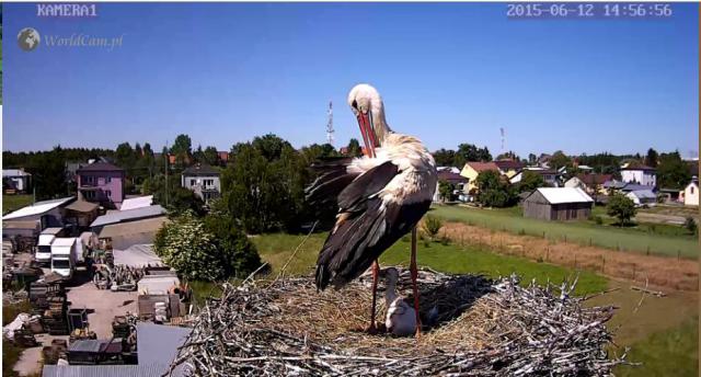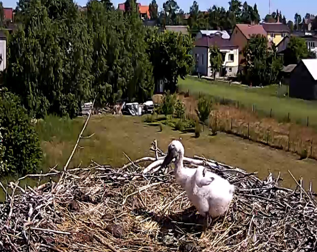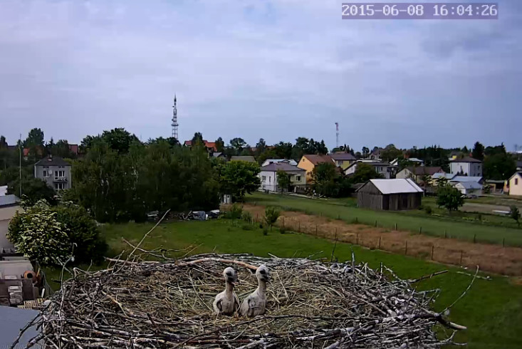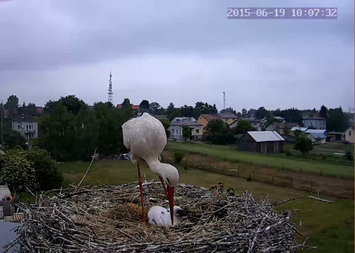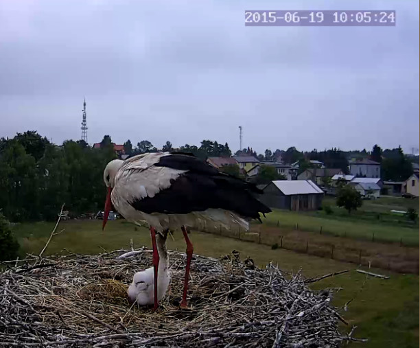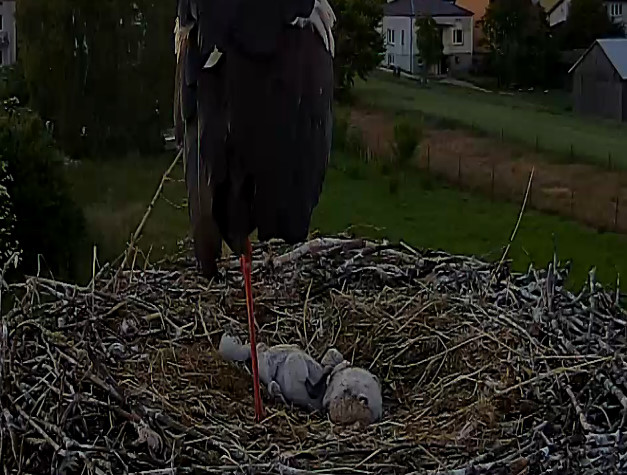 Dzisiaj maluchy zostały same. Rodziców nie było od 14,55 do 16,20. Brak opadów nie sprzyja bociankom. Pożywienia mniej.