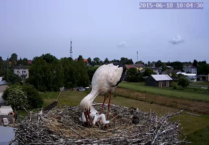 Dzisiaj od godziny 11,00 nasza bociania rodzina to 2 + 2. Piórek wyeliminował najmłodsze pisklę. Nie zrobił tego z brutalności, lecz kierował się instynktem. Może mały był chory ? Nie poznamy odpowiedzi na to pytanie.
