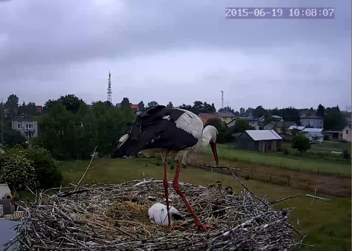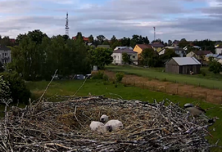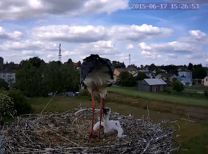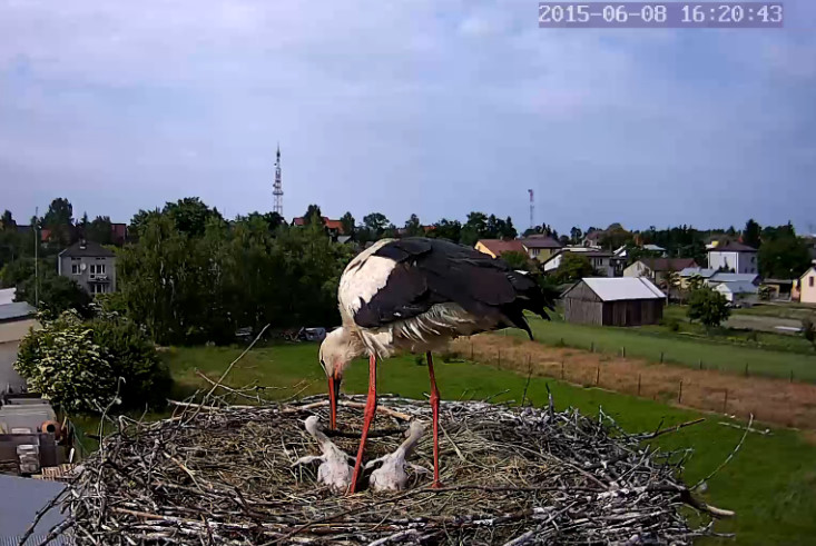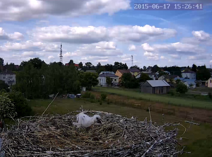 Dzisiaj maluchy zostały same. Rodziców nie było od 14,55 do 16,20. Brak opadów nie sprzyja bociankom. Pożywienia mniej.
