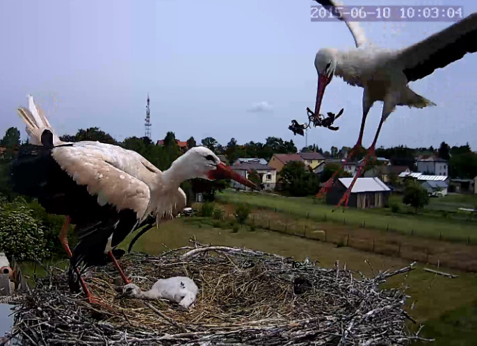 Dzisiaj od godziny 11,00 nasza bociania rodzina to 2 + 2. Piórek wyeliminował najmłodsze pisklę. Nie zrobił tego z brutalności, lecz kierował się instynktem. Może mały był chory ? Nie poznamy odpowiedzi na to pytanie.