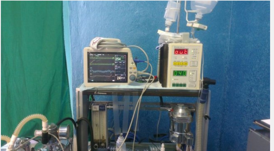 Przygotowanie pola operacyjnego, obok monitor EKG i oddechowy, monitorujące ptaka podczas operacji (ptaki mają znacznie wyższą częstość akcji serca niż ssaki, 254 uderzenia/minutę).