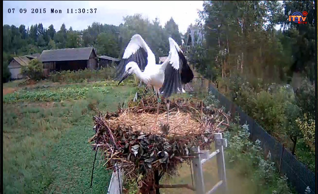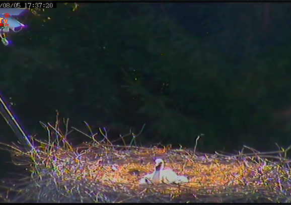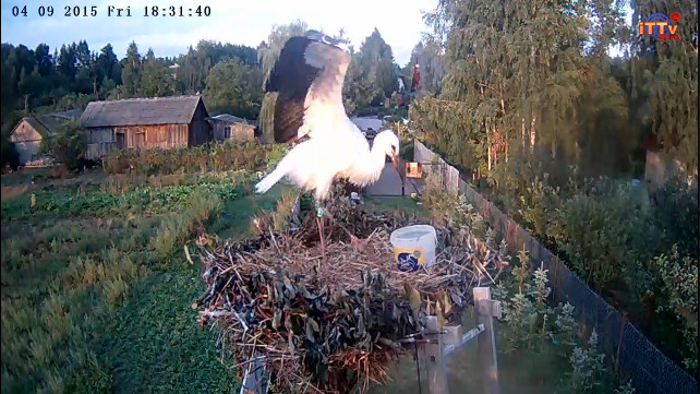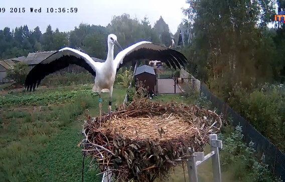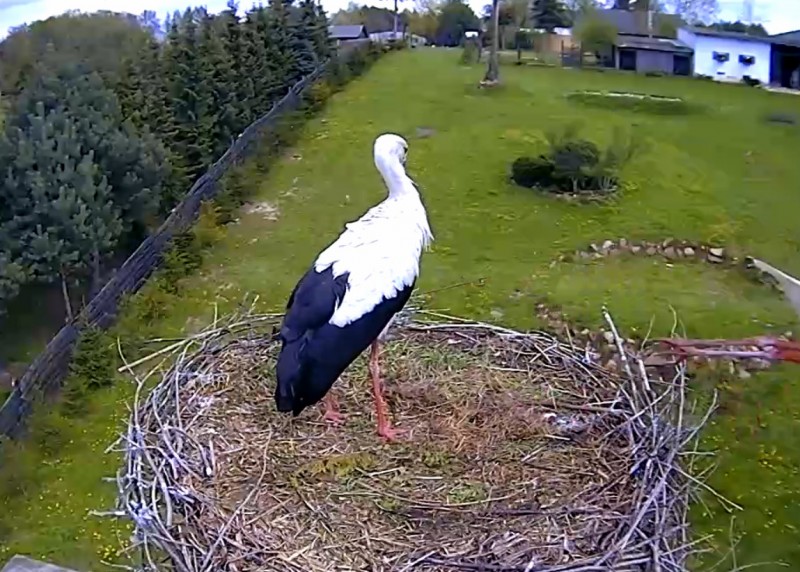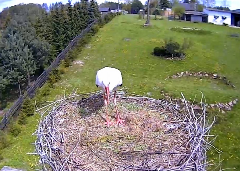 "Około godziny 14, w naszym gnieździe bez kamery umownie nazywanym g2, wylądował przybysz z Afryki. Niestety nie ma obrączek, więc nie jest to żaden z naszych ubiegłorocznych bocianów. Od tamtego czasu cały czas przebywa na naszym terenie. Kilkukrotnie lądował w każdym z gniazd, żerowal, a nawet raz zaniósł kępkę siana do gniazda głównego.