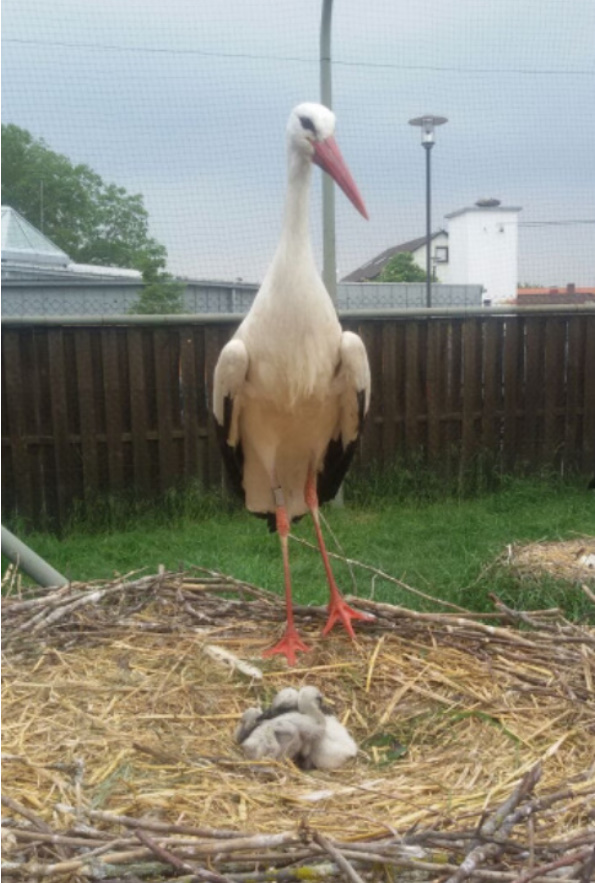 W Bornheim od lat przebywa kaleka para z wielkim instynktem rodzicielskim ale, niestety, z racji wieku ( samica ma ponad 30 lat) niezdolna już do prokreacji. Opiekunowie na początku sezonu, po próbach kopulacji pary, podkładają im sztuczne jaja. Para opiekuje się tymi jajami i w momencie konieczności , w miejsce tych „erzaców”, para dostaje na wychowanie bocianiątka w potrzebie. Tak było i w tym sezonie.